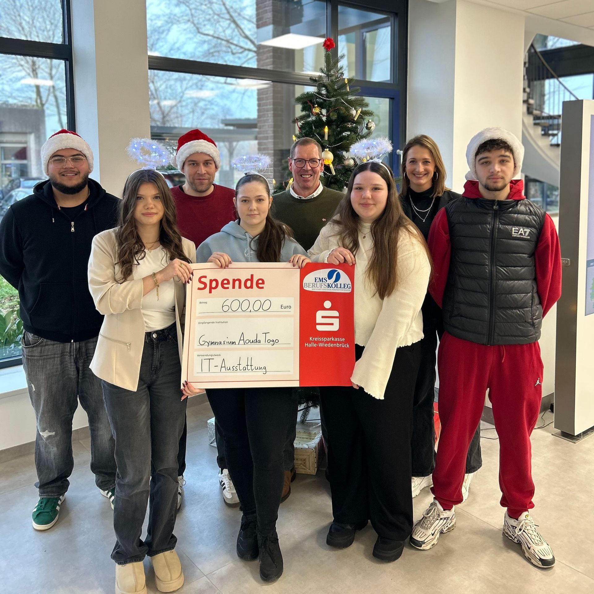 Die traditionelle Nikolaus-Aktion am Ems-Berufskolleg wurde wieder von der Schülervertretung (SV) organisiert. Schülerinnen und Schüler sowie Lehrkräfte konnten dabei Schokonikolaus-Karten kaufen. Auf den Kärtchen konnten kleine Grüße und der Name der beschenkten Person notiert werden. Der Nikolaus und sein Knecht Ruprecht verteilten gemeinsam mit einigen Engelchen (SV-Schüler des Ems-Berufskollegs) die Schokonikoläuse in den Klassen und sorgten für strahlende Gesichter. Das Ergebnis kann sich sehen lassen: Dank der fleißigen Teilnahme sind 607,60 Euro zusammengekommen! Der gesamte Betrag konnte nun an den Togo-Förderverein Rheda-Wiedenbrück übergeben werden, der dafür sorgt, dass die Spende an der Partnerschule des Ems-Berufskollegs, dem Gymnasium Aouda in Togo, auch ankommt. Der bereits seit rund 30 Jahren bestehende Kontakt zur Partnerschule hat über das Jahr per E-Mail funktioniert. Der diesjährige Betrag soll zur Anschaffung von weiteren Deutschbüchern und zur Finanzierung des Schulgeldes für besonders Bedürftige genutzt werden. Außerdem sind die ersten Kontakte zwischen Schülern des Ems-BK und Schülern des Gymnasiums Aouda per WhatsApp entstanden..